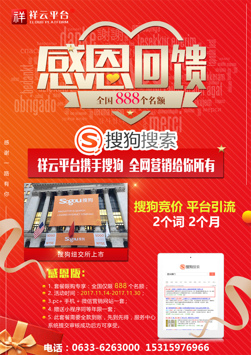 2017年11月9日,搜狗在紐交所上市,成為國內(nèi)第二大搜索引擎,祥云聯(lián)合搜狗,推出2017感恩鉅惠活動:凡簽約祥云營銷型網(wǎng)站,即送搜狗競價(jià)關(guān)鍵詞,兩個(gè)詞,兩個(gè)月!名額有限,先到先得!電話:0633-6263000 15315976966